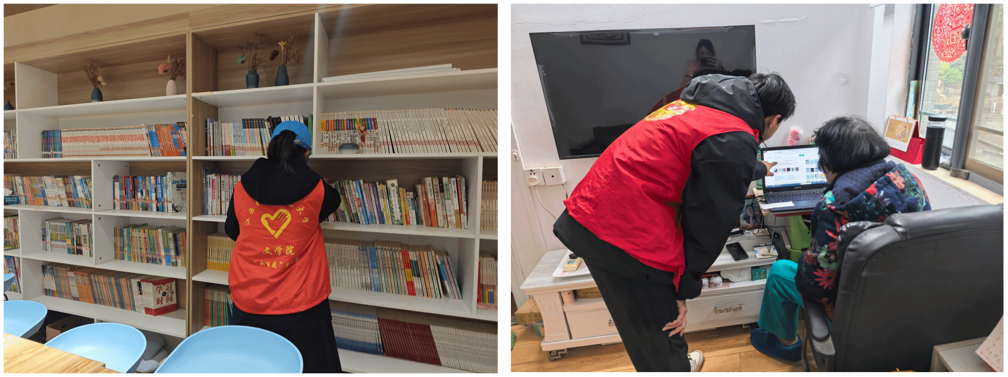 在琴江社区,学院党员和团员分组协作,对该社区图书馆进行了细致的整理,志愿者们整理书架、擦拭书桌、清扫地面,现场秩序井然有序,分工合理。他们还一对一的为社区老人提供了互联网教学服务,进一步消除了老年人面临的“数字鸿沟”,帮助社区老人融入智慧生活。