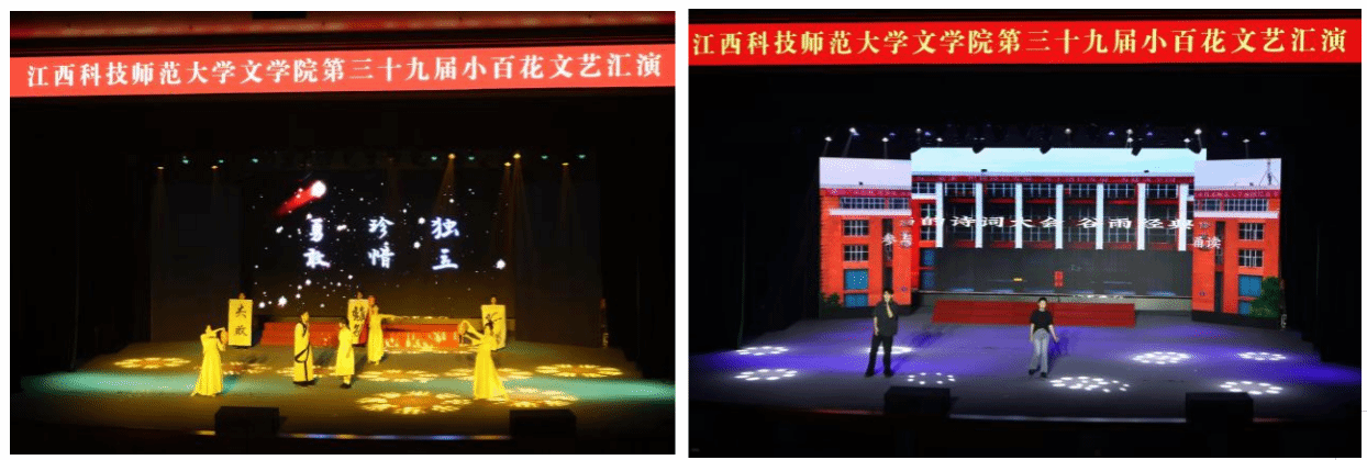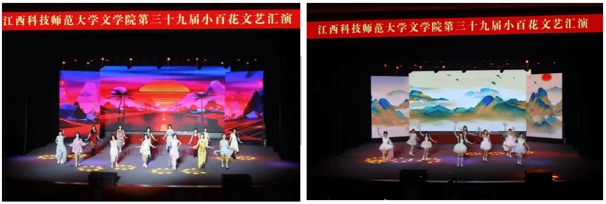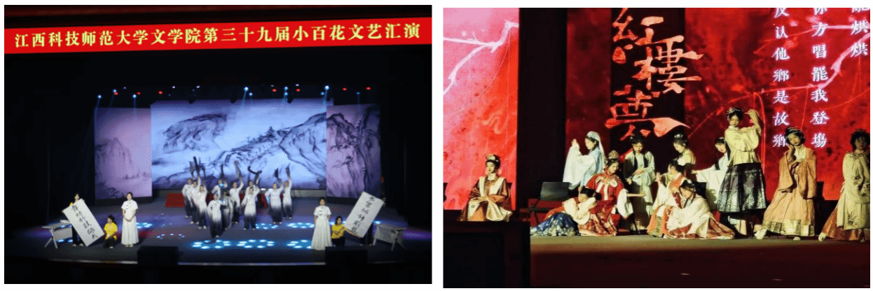 本次“小百花”文艺汇演共分“文承古韵,艺展新章”、“笔跃韶光,诗灼春华”以及“弦歌不辍,芳华待灼”三个篇章。随着《PoPstars》的动感旋律,晚会在欢呼与掌声中绚丽启幕。古典舞《墨舞丹青》以行云流水般的舞姿,在黑白交织间勾勒出中国传统书画的意境之美。汉服轻舞剧《再梦红楼》细腻还原经典人物,衣袂翩跹间尽显东方美学神韵。戏曲《贵妃醉酒》以精湛的唱念做打,将国粹艺术的魅力展现得淋漓尽致。朗诵《峥嵘井冈,诗行写春秋》字字铿锵,以澎湃激情抒写家国情怀,令在场观众无不为之动容。